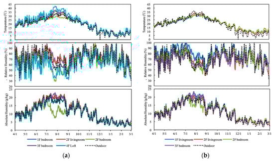 Figure 6 shows the temperature and humidity monitoring results of two households for almost 1 year. The indoor vertical temperature difference of House A in the summer reached 15 °C, which is much greater than that of House B. In the hottest month, the 2F bedroom of House A had a lower room temperature and relative humidity than the 2F bedroom of House B. This may be because House A used the air conditioner for a longer time than House B. During other times in the summer when the air conditioner was not used, House B had a lower average indoor temperature for this room than House A. In the coldest month, the average indoor temperature of the same room in House B was 0.3–2.3 °C higher than that of House A. Thus, double-glazed windows seem to improve the indoor thermal comfort of the house to some extent.