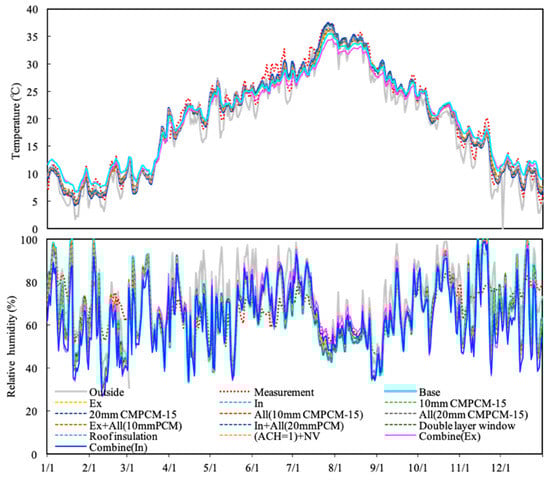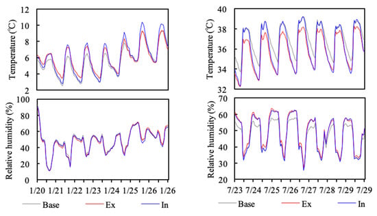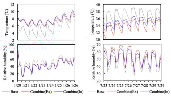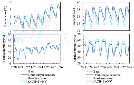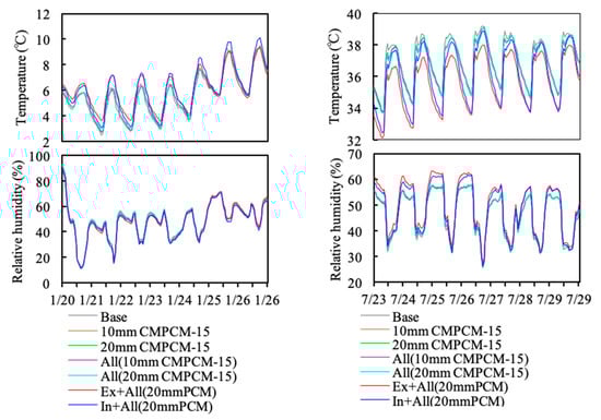 In order to analyze the impact of each case on the indoor thermal environment in the winter and summer in more detail, the hourly indoor temperature and relative humidity were also considered for the coldest week (January 20–January 26) and hottest week (July 23–July 29).