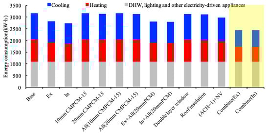 To compare the effects of different building envelope constructions on heating and cooling energy consumption, the energy conservation was considered in terms of the current lifestyle with the same conditions set for the equipment. The annual energy consumption of each case for the whole house was calculated. As shown in Figure 14, Case Combined (Ex) and Case Combined (In) significantly reduced the energy consumption. Case Ex, Case In, Case Ex + All (20 mm CMPCM-15), and Case In + All (20 mm CMPCM-15) also clearly affected energy consumption.