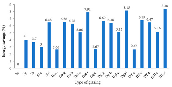 Figure 5 reflects the energy savings produced by the various glazing forms in Beijing’s cold climate, where heating is the dominant source of energy consumption. In this case, clear double-glazing has the best thermal performance irrespective of its thickness, with low-e glazing providing the largest energy reduction. The energy performance of ordinary windows is quite similar, with the 6/6 mm double-glazing group D producing the largest energy reduction of 11.14% (i.e., 3.42 kWh/m2/year including a cooling reduction of 0.34 kWh/m2/year and a heating reduction of 3.08 kWh/m2/year) caused by traditional double-glazing Da-c compared with the 14.23% (i.e., 4.37 kWh/m2/year including a cooling reduction of 0.72 kWh/m2/year and a heating reduction of 3.65 kWh/m2/year) produced by the low-e glazing Dal-c in the same category. Next to the 6/6 mm double clear low-e glazing (Sl-c, Sl-t, Dal-t, Dgl-c, Dgl-t, DTl-c, Dtl-t), the best energy saver is the clear double-glazing with 13 mm filled air (DT-c) at 13.36% (i.e., 4.10 kWh/m2/year including a cooling reduction of 0.30 kWh/m2/year and a heating reduction of 3.80 kWh/m2/year), followed by another form of clear double-glazing with a 6 mm gas layer (Dg-c) at 12.38% (i.e., 3.80 kWh/m2/year including a cooling reduction of 0.32 kWh/m2/year and a heating reduction of 3.48 kWh/m2/year).