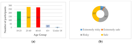 As seen in Figure 1a, a total of 824 participants responded, and 774 participants were recruited for analysis. Figure 1b reveals that mixed responses with an inclination toward “risky” were recorded about the risk perception of current conditions. The excluded participants came from the age group that did not fall under the scope of this study (under 18 and over 65) and were also underrepresented. Underrepresented data categories yield into unrealistic inferences. Therefore, participants in the age groups under 18 and 65+ were removed.