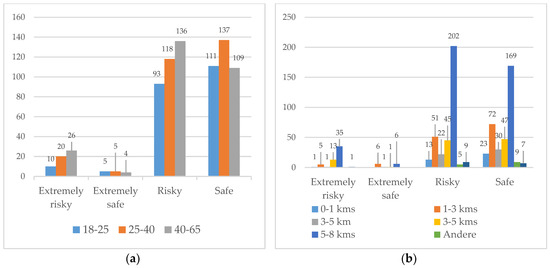 (a) Risk perception of current conditions, according to age category; (b) risk perception in terms of distance.