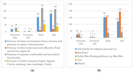 Figure 3b shows that road users who rely more on a sustainable option of alternate travel tend to rate it as “Safe”, i.e., bus/tram (N = 194), while the reliance on peer support (i.e., car use) is seen as a “Riskier” option (N = 152). This behavior may be because users are already adopted to sustainable modes of travel and prefer other sustainable travel modes as a reliable option.