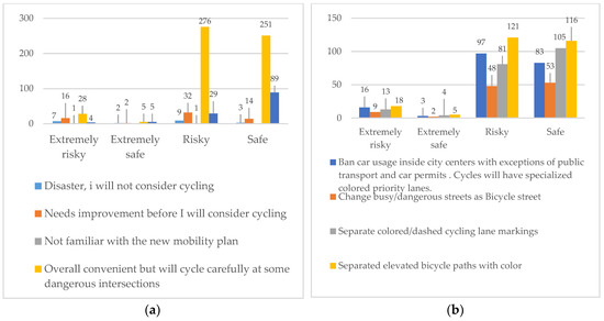 Figure 4a shows satisfaction toward mobility regulations, considering different risk levels. It is interesting to see that cyclists who rate current systems as “Risky” tend to choose “Overall convenience with care on dangerous intersections (N = 276, 79.53%)”, but people who rate the current systems as “Safe” (N = 251, 70.30%) also tend to choose “Overall convenience with care on dangerous intersections” with small decline “Safe and cycle every day (N = 89, 24.92%)” and a small increase, with results as χ2(12) = 119.174, p = 0.002, Cramer’s V value = 0.227, Kruskal–Wallis H test value (3) = 72.73, and p-value < 0.05. This eventually means that respondents feel that current systems are “Risky (N = 347)”, and yet are cognitively evaluating mobility regulations, still foreseeing dangerous intersections. A possible explanation is that, since those regulations only consist of traffic-sign measures with no infrastructural changes, i.e., bicycle streets (where cyclists have priority over motorized road users), one-way streets and banning car entry. In Flanders, banning car entry to specific streets or areas was introduced to give more freedom and access to non-motorized road users, with an exception for motorized road users who are residents. If those regulations had had any infrastructural improvement, i.e., segregation, elevation, and reconstruction, then they may have resulted as more effective into cognitive recognition.