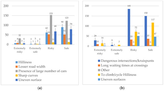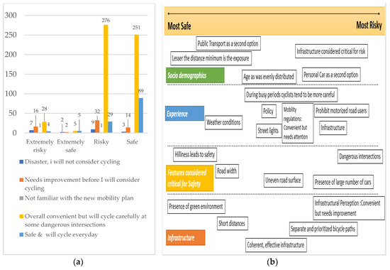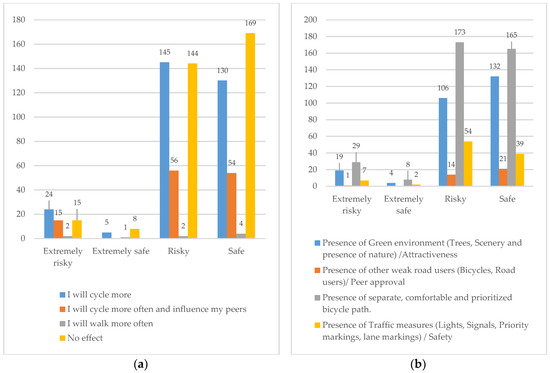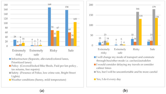 (a) Prioritized and elevated bicycle paths in terms of risk perception. (b) Perceived behavioral (critical things which motivate to cycle) w.r.t risk perception.