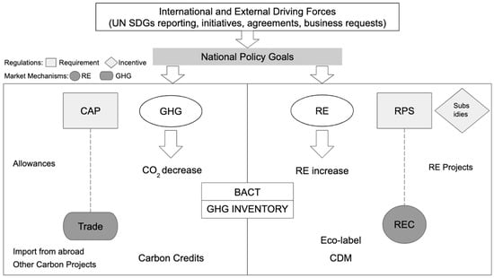 The degree to leveraging different techno-economic and regulatory means to provide clean, reliable, and competitive energy supply differs significantly between countries, as each country has its own distinct energy portfolio that meets the economic viability, social equity, and environmental profiles of the country. While restricting GHG emissions, often seen as an effective measure to alleviate global warming, policy-makers have now started to recognize the scale-up of renewable energy as an equally effective option that also addresses energy security concerns, yet the interlinkages of the policies between the GHG reduction and renewable energy development have not been sufficiently discussed. This is especially true for many of the emerging markets worldwide such as Far East Asia, where Japan, Korea and Taiwan had historically embodied the economic growth in the region that is now dominated by China. While capitalizing on the environmental value of green power is the common goal, one underlying factor, be it the environmental motivation (e.g., reducing fossil fuel dependence), political (e.g., phasing out nuclear power) or even business decisions (e.g., meeting the demand from international trading partners) may carry more weight than another. In the present study, we proposed a policy-oriented model, termed “Consolidated Climate Markets Mechanism Analysis” (CCLIMMA), integrating GHG reduction and renewable energy market development to describe the interlinkage between the two events. We aim to describe, retrospectively, in the framework of the proposed model how the East Asian markets of China (a fast-emerging economy, and the country that most invested in renewable energy development), Japan (a matured economy that seeks to meet energy demand while avoiding nuclear power generation), and Taiwan (a small and maturing economy seeking to liberalize its energy market and diversify its energy portfolio with increased share of renewable forms) evolved. The model can provide a basis for the prognostication of the markets moving forward.