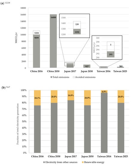 Potential of renewable energy for emissions reductions (a) and share of renewable-sourced electricity in current and targeted energy portfolios (b). Notes: 1 China: total emissions in 2016 accounted for 9,899 MtCO2 [21]. Total emissions for 2030 were based on China’s GHG reduction goal (reduce CO2 emissions per unit of GDP by 60–65% by 2030, [22]), and estimated from [23,24]. Avoided emissions from renewable energy generation were calculated by multiplying renewable energy generation in 2016 [25] by coal CO2 emission factor [26]. 2 Japan: total emissions in 2017 accounted for 1292 MtCO2 [27]. Japan plans to reduce emissions by 26% based on 2013 levels by FY 2030 [28]. Avoided emissions from renewable energy generation: renewable-sourced electricity (2017) [27] times coal CO2 emission factor from [28]. 3 Taiwan: total emissions in 2016 accounted for 293 MtCO2e [29]. Taiwan aims to reduce CO2 emissions by 10% by 2025 based on 2005 levels [30]. Avoided emissions from renewable energy generation: renewable-sourced electricity (2016) [31] times electricity emission factor for the same year [32]. 4 Avoided emissions from renewable energy generation for 2030 were not included to avoid double-counting of emissions. 5 China: electricity from renewable sources accounted for 24.1% of the sector’s total in 2016 [33]. China aims to source 20% of non-fossil energy in total primary energy consumption by 2030 [22,34]. 6 Japan: electricity from renewable sources accounted for 16% of the sector’s total in 2017 [27]. Japan aims to generate 22–24% of electricity from renewable sources by 2030 [28]. 7 Taiwan: in 2016, 4% of electricity was generated from renewable sources [31]. Taiwan aims to generate 20% of electricity from renewable sources by 2025 [35].