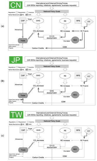 CCLIMMA model of (a) China, (b) Japan, (c) Taiwan, as of June 2018. Abbreviations: FIT, feed-in tariff; CDM, Clean Development Mechanism.
