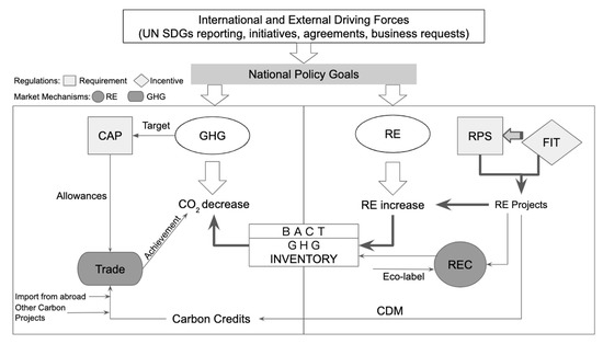 In order to meet the worldwide goal of GHG emission reductions, governments should aim to set domestic regulations regarding both renewable energy generation and CO2 emissions reduction. As evidenced in the aforementioned study cases, once the generation of renewable energy has been boosted through economic incentives (represented by FITs in Figure 4), effective growth of the renewable energy market will be achieved only if the government shifts towards setting national renewable energy generation goals (i.e., RPS). In this regard, competition among developers can be expected. The shift from an incentive-based through policy implementation to a market demand-based system is shown by an arrow in the upper right of Figure 4.
