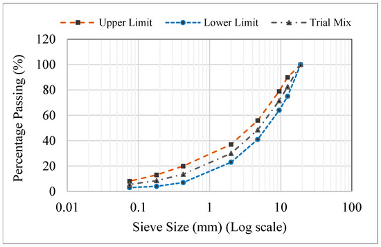 Aggregate gradation for the asphalt wearing course as per the Ministry of Transport (MOT)’s requirements.