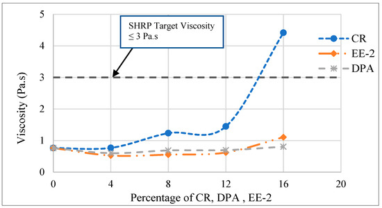 Figure 3 depicts that the viscosity values of the binders, each modified with 4%, 8%, 12%, and 16% of CR, EE-2, and DPA. They were all below the threshold value of the Strategic Highway Research Program (SHRP) standards, except for the 16% CR-modified bitumen. For EE-2 and DPA, it is clear from Figure 3 that the binders with 4%, 8%, and 12% of the additives succeeded in slightly reducing the viscosity of the control mix, providing better workability and less consumption of energy during the mixing process. On the other hand, the use of 16% EE-2 and DPA in the binders slightly increased the viscosity of the control mix compared to the original bitumen, but it was still within the limit of SHRP standards (i.e., viscosity shall be ≤ 3.0 Pa.s). The binder replacements with DPA and EE-2 exhibited very similar viscosity behavior. However, a substantial increase in viscosity was witnessed for bitumen modified with 16% CR which increased beyond the target and, hence, was not feasible for use due to the reduced workability and the need for more energy during the mixing process.
