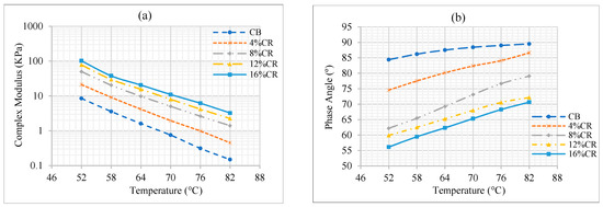 Effect of temperature on (a) the complex moduli and (b) the phase angles for CR.