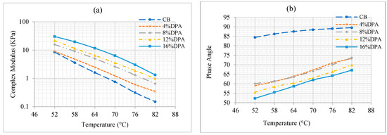 - The visco-elastic behavior of binder was significantly affected by the increase in the temperature and percentage of CR, EE-2, and DPA as a bitumen replacement. The modified binders showed improved elasticity, as compared to the base bitumen, due to the increase in complex modulus (G*) and the reduction in the phase angle values. Similarly, the increase in temperature caused a decline in the complex modulus because of the viscous behavior of bitumen.