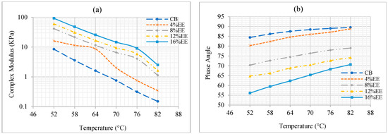 Due to asphalt’s visco-elastic nature, asphalt actions depend on the temperature rates and high loading times. The effectiveness of the temperatures and loading times were evaluated using a DSR device. Figure 4a, Figure 5a and Figure 6a show the relationship between the temperature and the complex modulus which indicates the binder resistance to deformation. In Figure 6a, the complex modulus for 4% EE-modified bitumen shows an increase and decrease at 60 °C to 66 °C, and this may be due to the development of polymer networks [32]. Figure 4b, Figure 5b and Figure 6b show the relationship between the temperature and phase angle which indicates the binder’s elasticity behavior. Figure 4, Figure 5 and Figure 6 depict improvements in the complex modulus as well as the decrease in the phase angle with an increase in the percentage of modifier at all test temperatures (46, 52, 58, 64, 70, and 82 °C). Hence, this improvement in the complex modulus and decrease in the phase angle gives better resistance against deformation compared to the control binder (CB). A new parameter, Glover–Rowe analysis from the frequency sweep data, can be used to predict pavement distress [33]. This parameter is more effective in predicting the low temperature and fatigue performance of the binders [33,34].