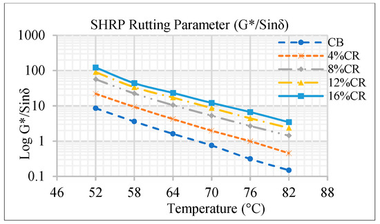 The temperature and modified percentage effect on the rutting parameter of CR.
