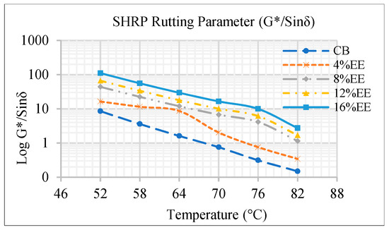 The temperature and modified percentage effect on the rutting parameter of EE.