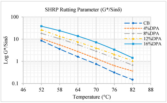 The temperature and modified percentage effect on the rutting parameter of DPA.