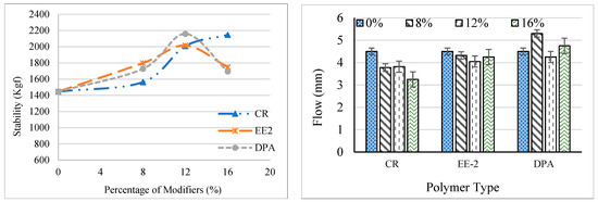 The test was done following ASTM D6927. Figure 10 shows and illustrates the Marshall stability and flow values that corresponded to different percentages of CR, EE-2, and DPA. It is worth mentioning that the stability of all modified mixtures was higher than the control samples. Both EE-2 and DPA showed quite similar trends in increasing the stability value to 12% and then experiencing a drop in stability at 16%. However, the CR-modified samples showed a continuous increase in stability for all samples. Furthermore, 12% DPA-modified mixtures exhibited the highest values for stability as compared to all other modifiers at the same percentage. The drop in stability beyond the 12% addition may be due to the excess amount of modifier resulting in the fact that the mix was not able to mix with the aggregate properly. Therefore, the optimum percentage of modifiers (CR, EE2, and DPA) was selected to be 12%. Figure 10 illustrates that the Marshall flow value for CR-modified bitumen decreases with the increase in percentage of CR. In the case of EE-2-modified mixtures, the flow value showed a reduction for 8% and 12% EE-2 and then a slight increase for 16% EE-2. Furthermore, a different behavior was noticed in DPA-modified mixtures, and it can be seen from Figure 9 that the flow value for the DPA-modified mixtures first increased for 8%, decreased for 12%, and then again increased for 16%.
