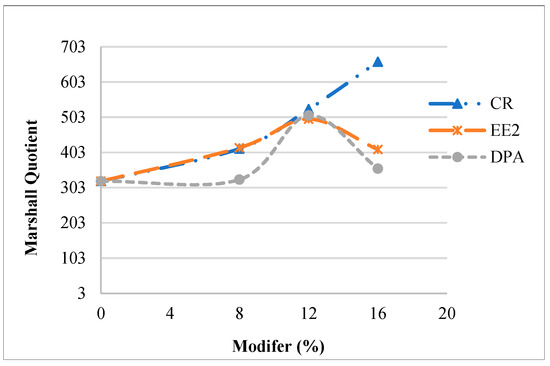 The Marshall quotient is the property which indicates the resistance against the deformation of an asphalt mixture, and it is calculated by dividing the Marshal stability by the flow value. A greater marshal quotient value represents its improved resistance against rutting [35,36]. From Figure 11, the highest Marshall quotient for EE2 and DPA was observed at 12%, and CR had the highest among all the binders which was at 16%. Since 16% CR does not satisfy the viscosity requirement, more energy will be required for mixing and the workability will also be affected. Therefore, it can be concluded that 12% binder replacement with CR, EE-2, and DPA can contribute to the resistance of mixtures against pavement deformation.