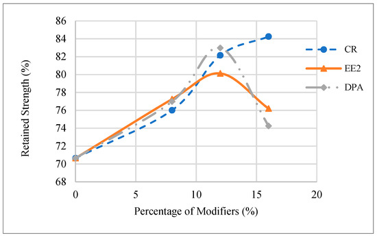 It is clear from Figure 12 that the retained stability of all modified binders increased which indicates improvement in the binder adhesion with aggregates. Moreover, the control sample did not meet the minimum value for retained strength and, hence, stripping was likely to occur in the control samples. This is the major reason for premature failures of the surface layer due to the loss of the aggregate–bitumen bond following water infiltration. Furthermore, CR, EE-2, and DPA with a 12% dosage showed the optimum retained stability.