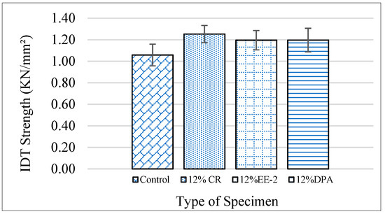 It can be concluded from Figure 13, that the mixtures modified with 12% CR, EE-2, and DPA showed improved IDT strength as compared to the controlled samples. The highest tensile strength was achieved using a 12% CR-modified mixture, whereas 12% EE-2 and 12% DPA exhibited similar results to each other as confirmed below by the statistical analysis.