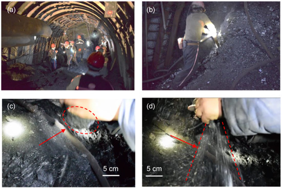 A typical soft coal roadway is located at Guobei coal mine, in Huaibei coalfield in the east of China. The buried depth of this roadway is around 700–750 m. A conventional retreat Longwall Top Coal Caving method (LTCC) was utilized. A designed support system (i.e., rock bolts, U-shaped steel set, and shotcrete) was applied to such a roadway (see Figure 1a). The coal—with a thickness of around 10 m—is extremely soft, and collapse and spalling normally occur when tunneling a roadway (Figure 1b). The immediate and main floors are 2.0 m thick mudstone and 15 m thick sandstone, respectively. The immediate roof with mudstone is 2.7 m in thickness, and the main roof with sandstone is 23 m in thickness. A field test of such soft coal is shown in Figure 1c,d; an intact coal sample can be easily crumbled just by hand. The fractures and cracks were full in the coal mass, because of the frequent tectonic movement of coal layers in this coalfield historically. Such soft coal mass easily experiences rheology. The poor geological conditions normally cause the failure of the original support system, and, therefore, a larger deformation of the roadway occurs.