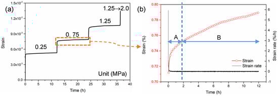 As described above, the rheological soft coal mass had a negative effect on the roadway stability. Thus, a uniaxial creep test with multi-stage loading was performed on a soft coal specimen to evaluate its time-dependent property. A constant loading (σ1) was applied on the specimen and maintained for a certain time (t1); then, the loading was increased to σ2 and kept CONSTANT from t1 to t2. Then, the mentioned procedures were repeated several times until specimen failure. The sketch maps of the loading and strain–time curve are shown in Figure 2. The creep results of the coal specimen are shown in Figure 3. It is clear that the soft coal specimen under various loadings displayed time-dependent strains during the creep stages of the tests. The specimen began to creep under a small stress condition (0.25 MPa). Normally, with lower stresses, the creep of the coal sample exhibits a two-stage creep behavior (stage A, decelerating creep, and stage B, uniform creep behavior), as shown in Figure 3b. With an increase in stress, sometimes the specimen directly fails during its loading process (the last loading is shown in Figure 3a). Overall, it has been indicated that the time-dependent behavior of soft coal cannot be ignored.