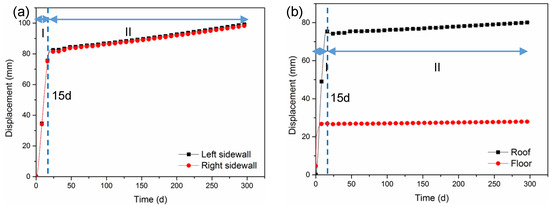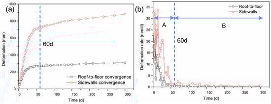 Then, the deformation rate of the roadway was calculated by the monitoring data (shown in Figure 4b). Similar to the creep behavior of a coal specimen, there were also two rheology stages (Stages A and B) of the roadway. Stage A showed that the displacement rate decreased quickly, in around 60 days, and the maximum values of the sidewall convergence rate and roof-to-floor convergence rate were 33.5 mm/day and 23 mm/day, respectively, showing a decelerating rheological characteristic. The deformation rate in Stage B was small but still larger than zero, signifying the rheological deformation increased gradually.