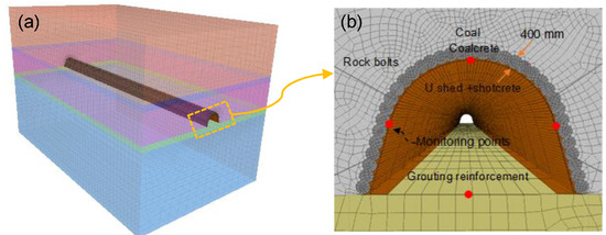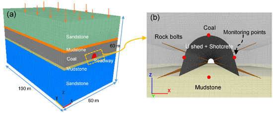 A FLAC 3D (fine difference code) numerical model was established to simulate the deformation properties of soft coal roadway (Figure 5a). The size of the roadway, the lithology of strata, and their corresponding thickness were consistent with the real situation. To minimize the boundary effects, a domain 60 × 60 m was selected at XZ direction, which was about ten times the span of the roadway section. In the YZ direction, the length was set as 100 m and the studied cross-section was chosen in the middle of the roadway. The element size and aspect ratios were refined near the roadway and gradually increased outwards. The support structures, such as rock bolts and shotcrete, were generated in the model by cable and shell structural elements, respectively. The U-shaped steel sets were simulated by shell element by converting their supporting effect to equivalent elastic modules of the shell. The properties of the support materials are given in Table 1. Some monitoring points were set on the roof, floor, and sidewalls of the roadway to obtain the displacement (shown in Figure 5b). The vertical stress and horizontal stresses applied to the model were taken from the literature about this coal mine [27].