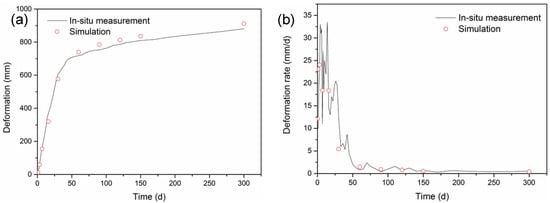 A 300 day creep run was set in the established model, and the monitoring results are depicted in Figure 6. Ten representative time points (i.e., 0, 1, 3, 7, 15, 30, 60, 120, 150, 300 d) and their corresponding displacements were select from all calculation results (as shown in Figure 6a by the red circle). The deformation rates at these points were further calculated (as shown in Figure 6b by the red circle). As can be seen, compared with the field measurement, the simulated results were close to the real displacement, not only in tendency but also in specific values, confirming that the time-dependent model and its input parameters are reasonable and accurate.