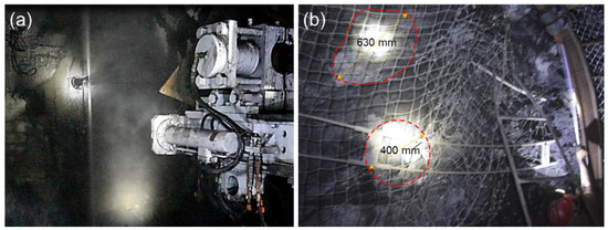 As mentioned above, the JG method can improve the mechanical properties of the soft coal mass and therefore reduce the deformation of the roadway. To examine the applicability of the JG, a field test was conducted (shown in Figure 7a). With the drill stem withdrawing in the drilling hole (reverse speed of 20 cm/min), the high-pressure cement grout (23 MPa) with a high jet velocity rotated and cut the coal mass (rotating speed of 18 r/min), then mixed with coal particles, and, finally, a coalcrete column was formed. In the field, parts of the soft coal mass around the roadway profile (approximately 400–600 mm in range (Figure 7b)) could be replaced by coalcrete after JG application. This meets the requirements of a roadway support system by coalcrete columns and indicates that the JG technique in a soft coal mass is practicable and promising.