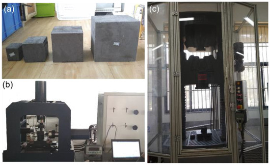 The coalcrete is a composite with high strength and a high deformation modulus. Considering its size effect, a series of shear tests and compressive tests with various sizes of specimens were carried out to determine mechanical parameters (Figure 8). The coalcrete specimens (50, 100, 150, 200 mm) were prepared in the laboratory (shown in Figure 8a). The cohesion and friction angle of coalcrete were obtained by shear tests (Figure 8b), and the deformation modulus and compressive strength were gained by uniaxial compressive tests (Figure 8c). Furthermore, according to the fitting functions mentioned in the literature [33,34], the empirical equations, reflecting the size effect on the strength properties of coalcrete, were further established. By using these equations, the mechanical parameters of coalcrete with 400 mm in diameter were determined and are given in Table 4.