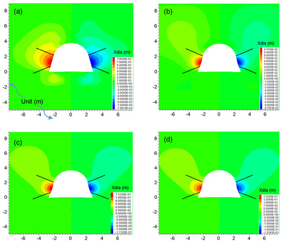 The horizontal displacement of the roadway after JG support is depicted in Figure 10. As can be seen, with the increase in time, the moving areas of the sidewalls of the roadway gradually expanded (Figure 10a,b). After 15 days, the movement of the two sidewalls was not obvious. From 30 to 300 days, the horizontal displacement increased slowly (Figure 10c,d). The movement range of the surrounding coal mass was basically unchanging, and the displacement values were relatively small in this period.