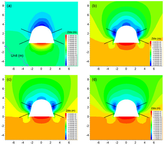 The vertical displacement of the roadway after JG support is displayed in Figure 11. It can be seen from Figure 11a that, after the excavation of the roadway (3 days), the displacement of the floor was obvious, and that value accounted for the majority of the total floor deformation. With the increase in time, the roof and shoulder of the roadway also began to deform (Figure 11b). After 15 days, the deformation around the roadway was basically stable (Figure 11c). By 300 days, the vertical deformation of the roadway did not increase significantly, and only the movement area in the coal mass slightly expanded, owing to the long-term creep behavior of the soft coal mass on the roof (Figure 11d).