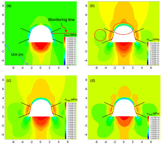 The maximum principle distribution around the roadway by JG support with time: (a) 3 days; (b) 15 days; (c) 30 days; (d) 300 days.