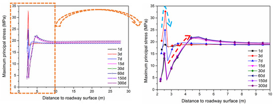 In addition, a monitoring line (shown by a red dashed line in Figure 13a) was set in the middle of the roadway to obtain the changes in maximum principal stress with time (1, 3, 7, 15, 30, 60, 150, 300 days). The monitoring results are shown in Figure 14. As can be seen, the stress in the coalcrete column increased with the distance to the roadway surface (about 0.4 m within the JG columns). With the increase of time, the peak value of stress in JG columns gradually decreased, indicating that the JG columns gradually failed, and the corresponding bearing capacity decreased. However, the minimum peak value in the JG column was about 15 MPa, which was far greater than 4.9 MPa in the coal mass (reflecting the bearing capacity of the coal mass). With the increase in the distance from the roadway surface, the maximum principal stress in the coal mass gradually increased, until the second peak value of stress (22.08 MPa). This value in the coal mass was close to the initial stress (19.2 MPa), demonstrating that a lower stress concentration accumulated in the coal mass, and therefore JG support optimized the stress conditions around the roadway effectively.