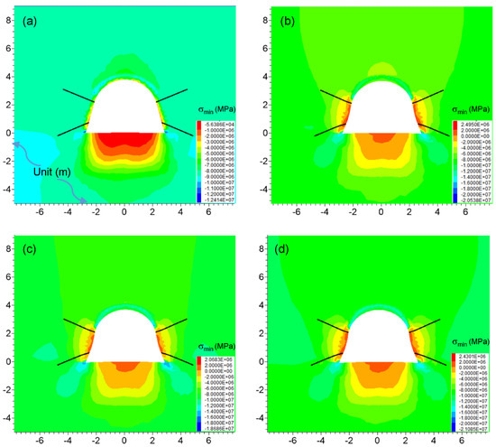 The distribution of the minimum principal stress around the roadway by JG support is illustrated in Figure 15. After roadway excavation (Figure 15a), there were no tensile stresses in the surrounding rock mass, due to the reinforcement effect of the bottom corner of the roadway. However, there was still a large stress release zone in the floor as parts of the floor failed. With the increase in time, some small stress concentration areas gradually appeared near the roof and bottom corner of the roadway and basically remained stable (Figure 15b). From 30 to 300 days (Figure 15c to 15d), these areas were slightly enlarged by the rheological effect of the coal mass, but the stress concentration areas were not obvious, signifying that the JG support system can optimize the minimum principal stress around the roadway efficiently.