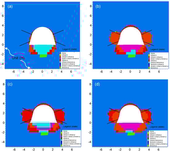 The development of the plastic zone around the roadway with time is depicted in Figure 16. After excavation (Figure 16a), there was no obvious damage on the roadway vault, but most parts of the floor failed. With the increase in time (Figure 16b), the plastic zone extended into the sidewalls, and the roof was also damaged to a small extent. The development of the plastic zone was basically in a stable state in this period. The failure zones of the roof, floor, and sidewalls did not noticeably expand from 30 to 300 days (Figure 16c to 16d). It is noted that, even at 300 days, the failure areas in the sidewalls were still within the anchoring range of the rock bolts, which avoided the sudden collapse of sidewalls. It should be pointed out that the plastic zones around the roadway cannot be eliminated absolutely. The most economic and efficient way is to stabilize the damage zone into a reasonable range. Overall, the proposed JG support system can reduce the plastic zone to a controllable extent and maintain the long-term stability of the roadway.