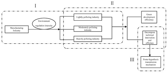 In order to explore how to set different environmental regulations in different industries to achieve the optimal value of green development efficiency, we developed an integrated approach. The proposed integrated approach is shown in Figure 2. As demonstrated in Figure 2, this proposed approach is mainly composed of three steps: The first step, according to the environmental regulation intensity, is to divide the manufacturing into heavy pollution industry, medium pollution industry, and light pollution industry. Then, the next step is employ the SBM, considering undesirable output to measure the green energy-environmental efficiency in different polluting industries. The Malmquist index method was used to measure the dynamic changes of the technical innovation and efficiency. Lastly, we investigated the transmission mechanism of the Porter hypothesis through panel data analysis.
