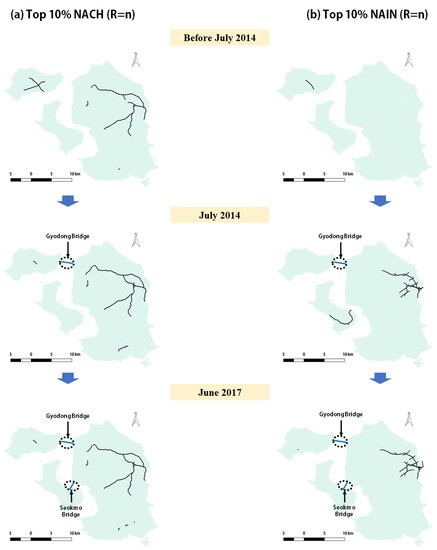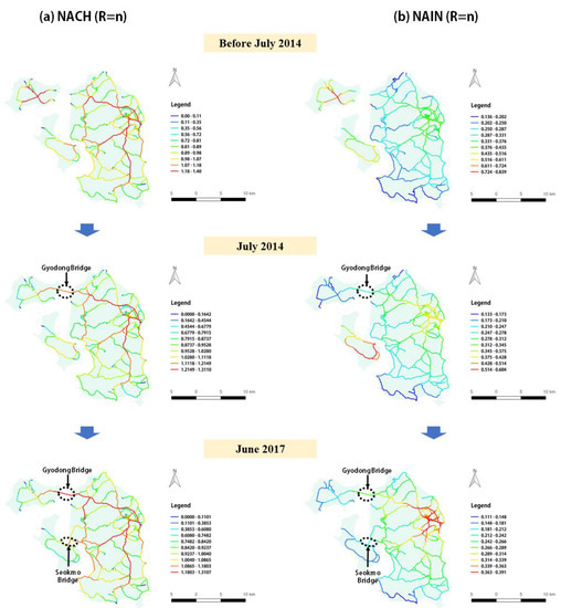 | Mean NAIN (Radii) | Origin (before July 2014) | Connecting Gyodong Bridge (July 2014) | Connecting Seokmo Bridge (June 2017) |