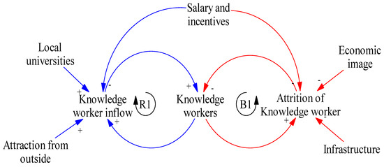 Figure 2 shows the conceptual SD sub model for the housing in the city. Housing is found to be a critical infrastructure that attracts or dissuades knowledge workers to join the IT industry in the city. There is also normal inflow of houses and the city has adequate stock of houses for normal use by the residents. However, due to the increase in population, there is an increased demand for the houses, consequently new construction occurs. On the other hand, the stock of houses is reducing because of normal depreciation and degradation of the houses, which forms a balancing loop B2. However, the inflow of houses because of new construction causes a reinforcing loop R2 and is likely to reinforce the housing stock. Although the demand for houses largely engenders from the population of the city, there is an additional demand for houses because of the significant student population. However, the knowledge workers have a demand for a specific quality (such as safe, fully furnished, and with amenities) of houses, which are not largely available. The demand for such houses also adds to the demand of houses in the city. Thus, investment for new construction including the construction of specific type houses suitable for knowledge workers and refurbishment of the degraded houses will increase housing supply in the city, which will be able to meet the demands of the human resource of the IT industry, including that of knowledge workers. This scenario is envisaged to further strengthen the reinforcing loop R2 and likely to counter the balancing loop B2. Consequently, housing infrastructure will become an important attracting factor for knowledge workers in their decision making to work in the city.