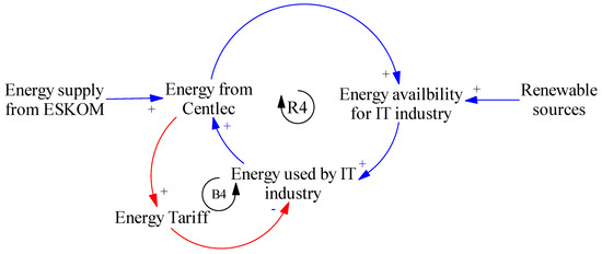 Energy (or uninterrupted power supply) is very important for the efficient functioning of the IT industry. So, energy is an important requirement for the IT industry development in the city. The city procures the energy from ESKOM (Electricity Supply Commission), a public sector company in the country, and distributes through CENTLEC (SOC) Ltd. (CENTLEC), a power distribution company under the Mangaung metro municipality. All the industries in the city, including the IT industry, procure energy for their requirement from CENTLEC. The energy supply is also reinforced by the energy available from the renewable sources such as solar energy in the city. However, it is noted that the availability of renewable energy in the system is not significant and does not contribute significantly to total energy supply. A discussion with the professionals from the energy industry revealed that although it is promoted theoretically, the availability and its contribution to the system will remain limited for a foreseeable period. The reason behind this challenge is the lack of renewable energy infrastructure and the need for significant initial investment to develop such infrastructure. Furthermore, although renewable energy can be argued to supplement the energy supply at the individual household level or at some organization level, according to professionals and experts of the IT industry, it is not a viable option as the IT industry itself or the institutions related to energy generation, supply, and distribution are not geared up to develop renewable energy infrastructure within a foreseeable future independently or institutionally. However, renewable energy harvested by the individual households and organization is likely to supplement the energy supply from CENTLEC. Therefore, renewable energy has been considered as a part of the total energy supply in the city. Currently, there is not much challenge with regards to meeting the energy demand of the city. So, energy procurement from CENTLEC and energy for the IT industry form a reinforcing causal loop R4 of demand and supply (Figure 4). However, the major challenge is the cost of energy (or energy tariff) for the industry, which is argued to be expensive and thus, causes obstacles in the development of the IT industry in the city leading to lesser use through the disruptive loop B4. So, R4 is getting balanced by B4 and does not assist in the development of the IT industry (Figure 4). Thus, there is a need to make the availability of energy at an affordable tariff for the IT industry for its growth.