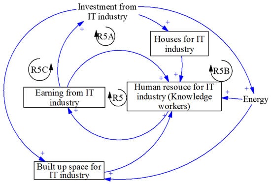 Figure 5 presents the conceptual integrated model for the development of the IT industry in the city. The model was developed by considering the influence of the four factors, such as knowledge worker, housing, energy, and built up space and their interlinkage with the IT industry. The development of the IT industry is measured by the earnings from the IT industry. As the availability of knowledge workers is vital for the earnings from the IT industry (according to experts from the IT industry, use of knowledge workers and work hours are major determinants of the costing of projects and earnings from them), both the variables develop a reinforcing causal feedback relationship. In other words, earnings from the IT industry increases because of the availability of knowledge workers and as earning increases, inflow of knowledge workers also increases. Consequently, both the stocks show positive growth. The CLD is represented by the reinforcing loop R5. Further, higher earnings enable the IT industry to invest in the housing required for the knowledge workers, making the desired quality of housing infrastructure available in the city, which would attract or influence the knowledge workers’ decision to come and work in the city, thus enhancing the knowledge worker pool. Consequently, it reinforces the earnings from the IT industry through CLD R5A. Thus, R5A reinforces the feedback mechanism R5. However, the investment from the IT industry directly on the education and for improvement of the living conditions of the city in general and consequent feedback on the human resource stock have not been considered in the model development. As per the opinions of the IT industry experts discussed with this could be a limitation of the IT industry in terms of direct contribution. Also, according to urban development and policy experts, since the metro municipality and government make budgetary provisions and regular investments for such social aspects, specific focus in this direction seems to be highly unlikely. However, there could be indirect effects. Further, higher availability of energy (at an affordable tariff) will allow the IT industry to function efficiently, which will lead to higher earnings from the IT industry. Consequently, it will enable the IT industry to invest in energy, which will facilitate the knowledge workers to be more productive, thus bolstering the earnings from the industry. This phenomenon is represented by CLD R5B. Thus, CLD R5B complements the CLD R5 and strengthens the IT industry. Similarly, built up space for the IT industry, will allow the industry to function without any uncertainty, which will also produce a heathy physical work environment. This in turn will enable the knowledge workers to work more efficiently and produce more leadings to higher earnings. Higher earnings will make the industry invest further in built up infrastructure. The phenomenon works through a feedback loop R5C. Thus, R5C reinforces the feedbacks mechanism R5. Consequently, the parent feedback mechanism between knowledge workers and earnings from the IT industry is reinforced by the three feedback mechanisms because of housing (R5A), energy (R5B), and built up space (R5C) for the industry. Therefore, it is envisaged that the combined effect of knowledge workers, infrastructure such as houses, energy, and built up space will enhance earnings from the IT industry in the city. Also, as a corollary, employment opportunities, particularly in the IT industry, will increase. The enhancement of earnings from the IT industry and increase in employment opportunities will contribute to the economic growth of the IT industry and the city.