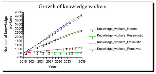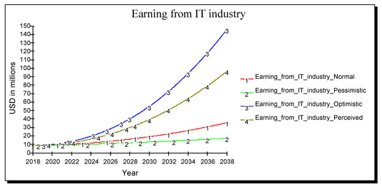 The knowledge worker is considered as an important parameter for the growth of the IT industry and earnings from the IT industry. Figure 7 presents the growth of knowledge workers under different simulated scenarios. It is found that under the business as usual scenario, the knowledge worker stock will increase at a low rate but gradually will reach about 2.2 times the current number of knowledge workers. However, under pessimistic scenario the growth will be very marginal and only an increase of about 31% may be expected. Under the optimistic scenario, the growth of knowledge workers shows a sharp rise particularly after the year 2021, reaching up to 6.00 times the current knowledge worker numbers by the end of projected year 2038. The perceived scenario presents a more gradual rise until the year 2023, after which the increase is more significant, and the number of knowledge workers will reach about 4.60 times the current level. Thus, it is indicated that if appropriate conditions are created, such as provision of housing, and built up space for IT industry are made, then knowledge workers will be attracted to the city, benefiting the IT industry in the city significantly.