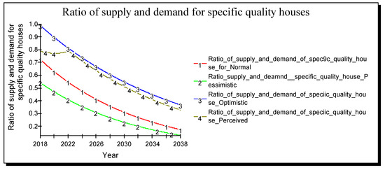 As mentioned earlier, under infrastructure, only houses and built up space for the IT industry were examined. Figure 8 presents the scenario of ratio of supply and demand of specific quality houses suitable for the IT industry personnel in the city. As evident from Figure 8, under the business as usual scenario, the ratio of supply and demand is about 0.7 in the current state, which is expected to decrease gradually over the projected period indicating significant unavailability of suitable quality of houses for the IT industry personnel. The situation will be exacerbated under the pessimistic scenario when there will be no investment from the IT industry, or no policy interventions are made from the city. However, contrary to this, if a large investment is made specifically for construction of such houses, as well as refurbishment of the degraded houses are made under optimistic scenario, the ratio of supply and demand will be high (gap between supply and demand will be very meagre) during the initial years, although the ratio may decrease gradually. This implies that under this scenario, there will be adequate availability of such houses during the initial years, although it may reduce later years because of more demand. However, the gap between supply and demand will be much lesser than the business as usual or pessimistic scenarios. The perceived scenario depicts that at an appropriate investment from the IT industry and refurbishment of the degraded houses to a specific standard suitable for IT industry human resource, the demand and supply scenario will remain within acceptable limits. It shows that supply will be at the 80% levels of the demand for the first five years, but will decrease gradually over the projected years. This indicates that the demand of such houses will remain if growth of the IT industry occurs in the city, however, with policy interventions, the gap between supply and demand will be reduced significantly. The higher supply of quality houses will also reinforce the housing infrastructure in the city.