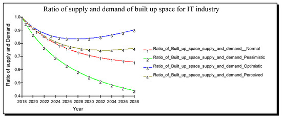 Figure 9 presents the ratio of supply and demand of built up space for the IT industry. It is seen, that under the business as usual scenario, there is a considerable gap between the demand and supply and it is likely to increase. Although the ratio is currently high, it will show significant reduction indicating that supply will not be able to match the demand. This scenario will be aggravated under the pessimistic scenario. This implies that if no policy interventions are made and certain conditions deteriorate, such as no investment occur from the IT industry, the supply of built up space will be drastically lower than the demand. On the other hand, there may be a significant change in the supply and demand status under the optimistic scenario. Initially the supply will match the demand, although it may show a gradual decrease for a few years from (2022 to 2028), after which it will again show gradual increase to meet the demand. However, if reasonable investments are made from the IT industry to create the built-up space for the IT industry and refurbishments of the degraded or unsuitable spaces under a perceived scenario, a gradual rise in the supply of built up space will be attained and the gap between supply and demand will decline gradually. It is also indicated that if the IT industry grows in the city, a significant demand for the built-up space will occur over the projected years, however, the supply will also increase significantly, which will reinforce the built-up space in the IT industry and in the city.