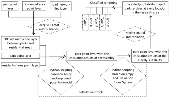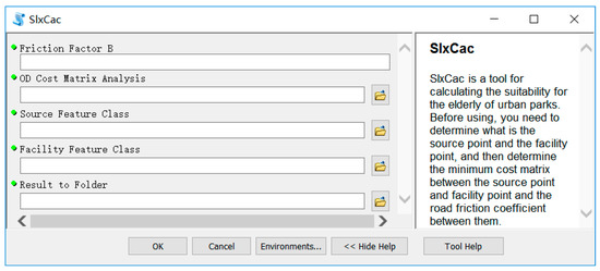 ArcPy can be used to practically and efficiently perform geographic data analysis, data conversion, data management, and map automation with Python [49]. In order to solve problems caused by large amounts of data (involving geospatial and general attribute data) and complex calculations as well as due to the fact that existing GIS software cannot directly evaluate the elderly suitability of urban parks, this paper customized a tool to evaluate the elderly suitability of parks by using Python script programming technology oriented to ArcGIS and based on the improved potential model and ArcPy [50]. Users can apply this tool to evaluate the elderly suitability of urban parks automatically and efficiently (Figure 2).