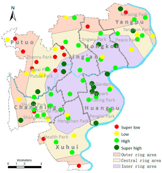 Figure 3 divides all parks in the Shanghai Central District into four levels according to their elderly-suitability value. The spatial distribution indicates that the elderly suitability of Shanghai urban parks tends to decrease gradually from the inner ring to the outer ring. This distribution also demonstrates the following trends: (1) most parks with super-high elderly suitability are located inside the inner ring and extend from southwest (Changning District) or southeast (Huangpu District) to northeast (Yangpu District); (2) most parks with high elderly suitability are also situated in the inner ring area, and the number of parks with high elder-suitability rapidly decrease in the central and outer rings; (3) the parks with low elderly suitability are mainly located in the central ring area, and these parks extend from the south (Xuhui District) or northeast (Yangpu District) parts of the central area to the central part of Putuo; and (4) the parks with super-low elderly suitability are mainly located in the central and the outer rings, but they stretch from the south (Xuhui South border) or northeast (Yangpu North border) parts of the Central Ring Line to the northwest (outer ring) area of Putuo.