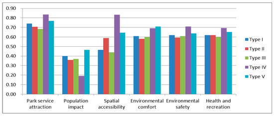 Based on the data from Figure 5, Table 5, and the relevant statistical yearbook, comprehensive analysis suggests that the above formation of the spatial pattern of park service is mainly caused by park service spaces’ population, economy, location, and policy factors. The inner ring of Shanghai Central is the heart of local economic and cultural development. Relying on the regional functional positioning and the development of the tourism economy along the Huangpu River, space type IV (which is located in the inner ring area) is generally better in urban road networks, park facilities, and other amenities. Parks are generally large (that is, of large mean value and small variance, as shown in Table 5), and their attractiveness, accessibility, safety, healthy entertainment, environmental comfort, and other aspects also reach the highest level in the central district. Additionally, since government offices occupy a lot of space in this area (that is, the impact of the population is quite small), the elderly suitability of park services in space type IV is higher. Although the residential space of type II is adjacent to the residential space of type IV, the area, attraction, environmental comfort, and other aspects of the parks in space type II are generally small. Therefore, the accessibility and the elderly suitability of the park services in space type II are both lower.