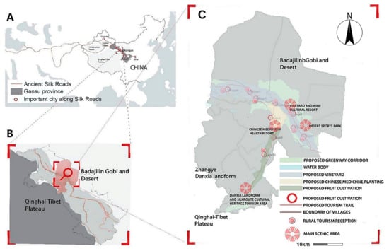 The location of the Zhangye cultural landscape corridor plan along the Silk Roads in Northwestern China. (A). General map of the Silk Roads area; (B). Our study area within the Silk Roads region, surrounded by the Badajilin Desert in the north and the Qinghai-Tibet Plateau in the South; (C). The current Zhangye cultural landscape corridor plan, including the proposed tourism trail and proposed development package projects (approved by local decision-makers).